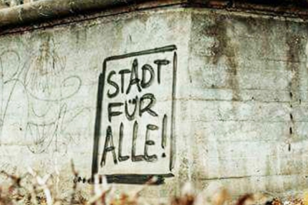 - Von Anfang an gab es das Spannungsverhältnis, ob wir das Konzept eher im Sinne einer klassischen Bündnisarbeit mit handlungsfähigen Gruppen und einem klaren Kampagnenfahrplan aufziehen oder ob wir „Stadt für alle“ eher als offenes Label nutzen, das sich viele aneignen können und unter dem wir zu offenen Versammlungen einladen. So richtig der Ansatz einer breiten und offenen Ansprache von unorganisierten Menschen ist, können wir feststellen, dass er unter den gegebenen gesellschaftlichen Bedingungen und mit unserer bisherigen Herangehensweise als Basis für einen gemeinsamen politischen Arbeitsprozess weitgehend gescheitert ist. Dass der Ansatz des offenen Labels demgegenüber zumindest für eine aktivistische Praxis durchaus auch Vorteile bieten kann, zeigt sich etwa in Frankfurt, wo stadtpolitische Aktivist*innen die Parole „Stadt für Alle“ an Prestigebauten schreiben und damit eine öffentliche Debatte in der Stadt provoziert haben.